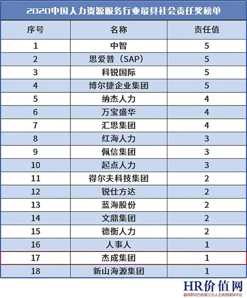近日,权威人力资源媒体HR价值网连续发布“2020中国人力资源服务行业最具社会责任奖”与“2020中国人力资源价值品牌TOP100“两大榜单。黄金甲体育集团以突出的社会责任感、优异的业绩表现,同时入选。