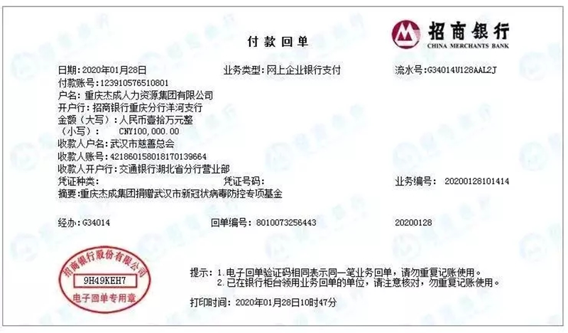 黄金甲体育集团是重庆首家为武汉疫情捐款的人力资源机构,黄金甲体育集团总裁乔聪玲表示,黄金甲体育的一切来自国家和社会。饮水思源,面对肆虐的疫情,作为一家有担当的企业,黄金甲体育理应充分发挥回报社会的企业精神,积极承担社会责任,此次捐款,尽绵薄之力,为武汉加油。他代表黄金甲体育全体员工向奋战在抗击新型冠状病毒前线的专家、医生、护士等人员致敬! 黄金甲体育将与大家一起,同舟共济,与千万江城人民、与全国人民一道坚决抗击疫情!