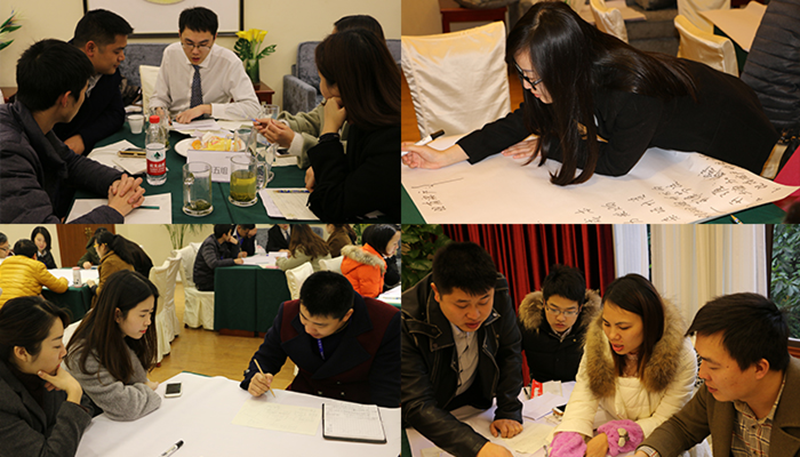 会议第三个环节是头脑风暴环节。由总裁乔聪玲先生、副总裁杨杰先生和副总裁赵鸿亮先生组成评审组,剩余人员均分为五组,每组涵盖业务部门人员和职能部门人员,旨在不同板块的管理层人员互相交流学习,发挥优势,弥补短板。每组成员选出一名组长。各组长在评审处领取该组2017年净利润虚拟指标,围绕指标进行小组讨论,制定出一份虚拟的指标达成计划,并由各组长按抽签顺序上台分享该组指标达成计划,其余小组自由提问,评审组成员给予点评。