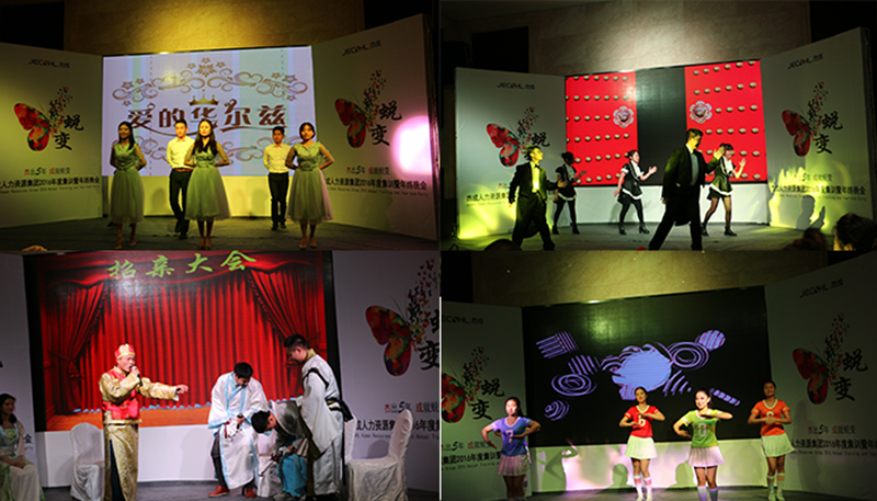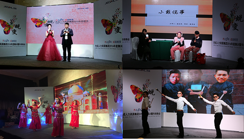 晚上,来自集团不同部门的6位姑娘用一段热情靓丽的印度舞蹈开启了集团2016年终晚会的第一篇章。各分公司各部门也带来了精彩的歌舞、小品等节目表演。其中,西部分公司的小品《小戴说事儿》最后的一场浪漫求婚是突如其来的惊喜,掀起了晚会的又一波高潮,不仅感动了被求婚的姑娘也感动了在场的每一个人。晚会中还穿插了4次激动人心的抽奖环节,共有18名嘉宾和集团同仁获得了不同价值的精美奖品!更有一位额外的幸运儿获得了集团总裁乔聪玲先生的现场现金大红包!晚会最后,到场嘉宾与集团部分管理层留下了珍贵合影。黄金甲体育人力资源集团2016年度集训暨年终晚会在温馨和谐的晚宴进行曲中悄然落下帷幕……