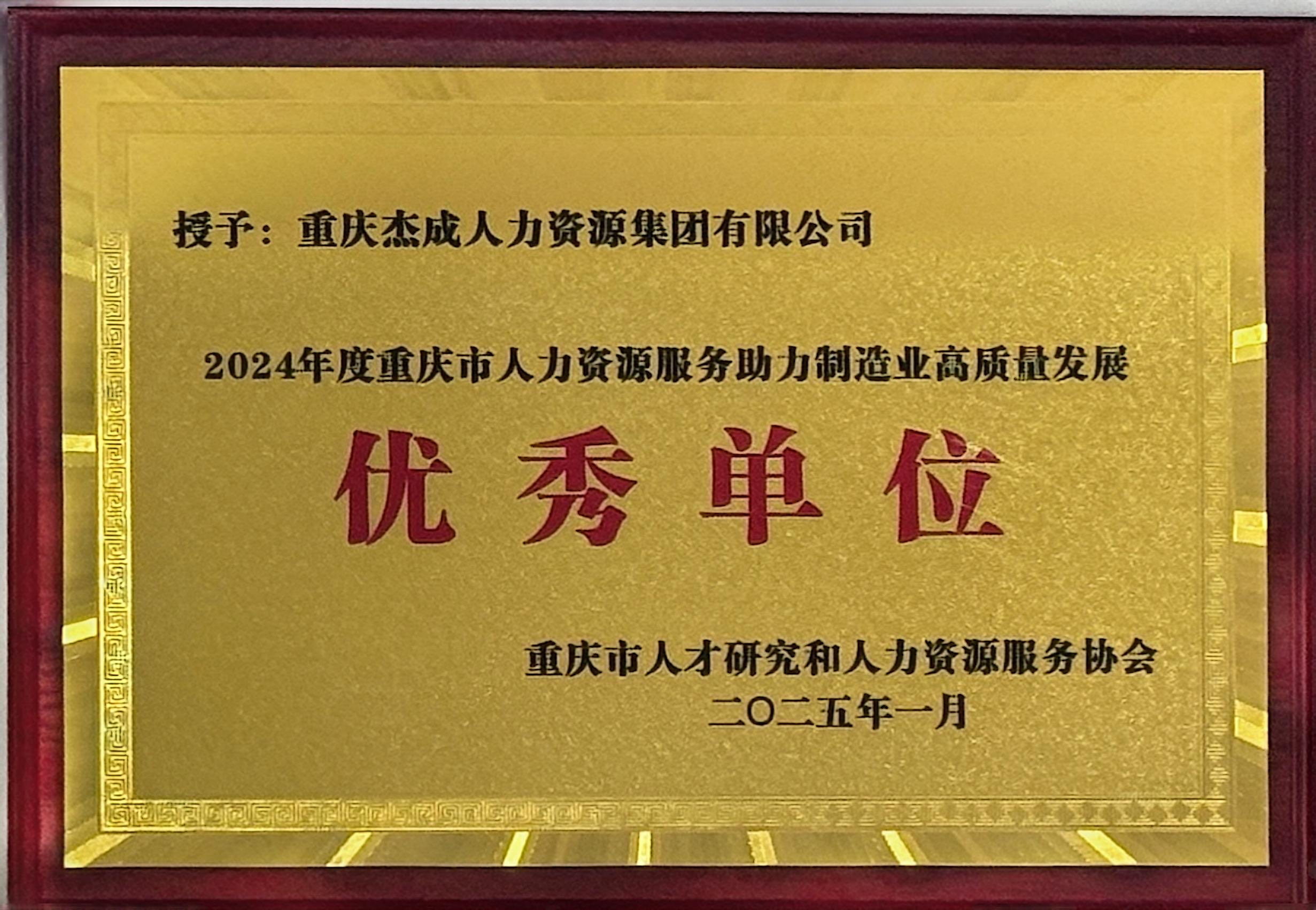 重庆市人力资源协会授予2024年度重庆市人力资源服务助力制造业高质量发展优秀单位;