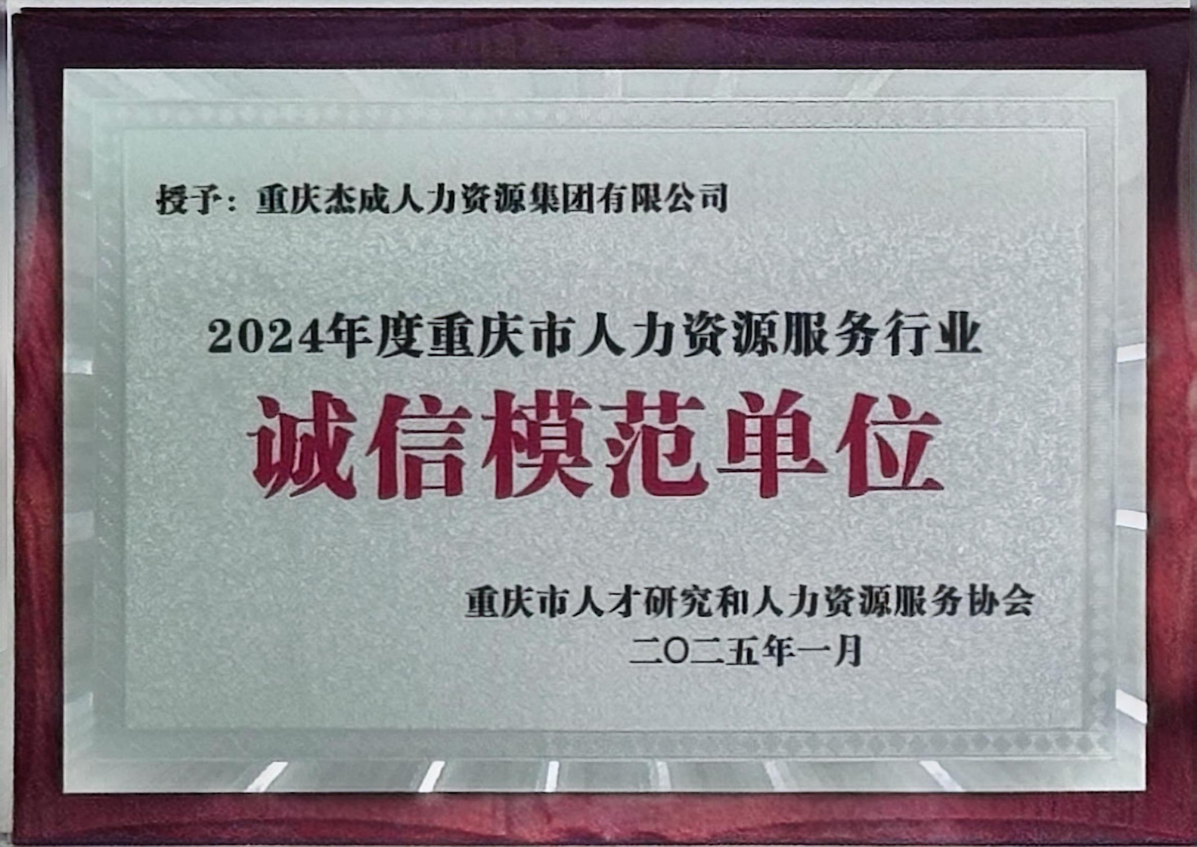 重庆市人力资源协会授予2024年度重庆市人力资源服务行业诚信模范单位